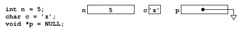 n = 5 means to put an integer value of 5 into the memory location referred to by n. c = 'z' means to put an encoded character 'z' into the memory location referred to by c. p = NULL means to put a value of 0 into the memory location referred to by p since NULL is simply defined as 0. We would call p a "NULL pointer" because it contains memory address zero. It is known that there is nothing at memory address zero. It's perfectly okay to point to it. But if you try to "see" what's in memory address zero (i.e., by dereferencing p), you will get a segmentation fault and your program will be killed by the operating system.