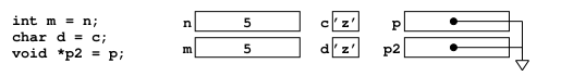 m = n means to evaluate the right-hand-side to get a numeric value and put the value into the memory location that's referred to by m. If you see a variable on the right-hand-side, you need to use the value at the memory location that's referred to by the variable. Similarly, p2 = p means to evaluate the right-hand-side to get a numeric value and put the value into the memory location that's referred to by p2. Since p is a variable on the right-hand-side, if you use the value at the memory location that's referred to by p, you would get 0. Therefore, you put 0 into p2. As a result, p2 will contain the same value as p (i.e., p2 will end up pointing to the same object as p).![]()