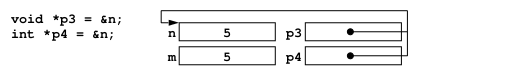 &n denotes the address of n. Therefore, p3 = &n means to put the address of n into the memory location that's referred to by p3. The same address can also be put into the memory location that's referred to by p4 (pointer of a different type) since all pointer data types are compatible.![]()