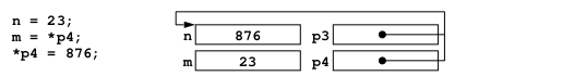 First, n set to contain 23. m = *p4 means to evaluate the right-hand-side and put the value in m. If we have just p4 on the right-hand-side, the right-hand-side would evaluate to what's in p4. But we have *p4 instead (where * is the dereference operator). So, we need to follow the pointer to where it points to and fetch what's there. p4 points to n; therefore, *p4 evaluates to what was in n and you end up putting 23 into m.![]()