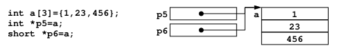 You need to be careful with pointer math. Although p5 evaluates to the address of variable a, the expression p5+1 will be calculated as p5+sizeof(int) (which is p5+4, which is the same as &a[1]) because p5 is declared as a pointer to int. Similarly, since p6 is declared as a pointer to short, the expression p6+1 will be calculated as p6+sizeof(short), which is p6+2, which would not correspond to any element of the a[] array.