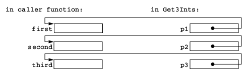 Inside Get3Ints(), when you need to set a return value, you would need to follow the pointer to set the return value. Therefore, your could would look like the following:![]()