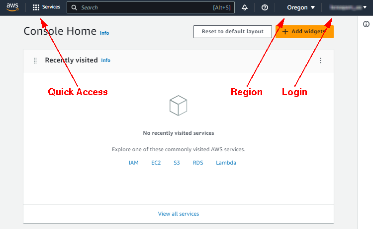 In the Recently Visited area, there are two important links. IAM stands for "Identity and Access Management" and it provides access permissions. EC2 is for creating and managing virtual machine instances.