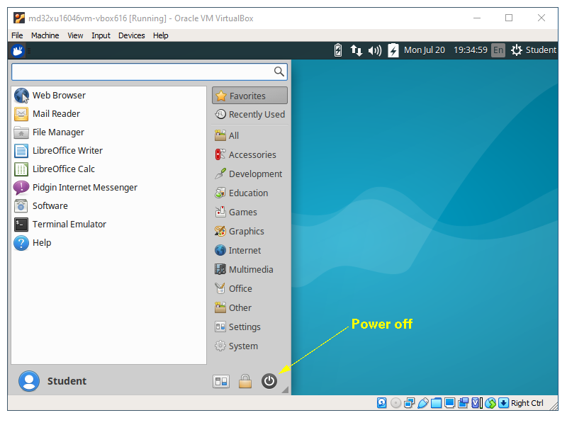 One more thing to try before proceeding... Maximize the window of your virtual machine and see if the size of the Ubuntu desktop would fill the virtual machine window. If the Ubuntu desktop size doesn't change, you should first install Guest Additions before proceeding. If the Ubuntu desktop resizes automatically, it means that you have Guest Additions already installed (which only needs to be done once). Step 3: Set Up Shared FolderIt's very useful to be able to exchange files between your virtual machine and your host machine. The way to do it is to use a shared folder. To setup a shared folder, you need to first shutdown your virtual machine. The proper way to shutdown your virtual machine is to click on Main Menu in the XUbuntu Desktop. You will get the following screen (which is the main Xbuntu Menu):From this screen, you can find a lot of programs to run. For now, just click on the Power off button in the lower right corner and you should get the following screen: Click on the Shut Down button to shutdown your virtual machine and go back to the VirtualBox start screen. If for some reason this doesn't work, you can also do the following. Start a Terminal and simply type the following: