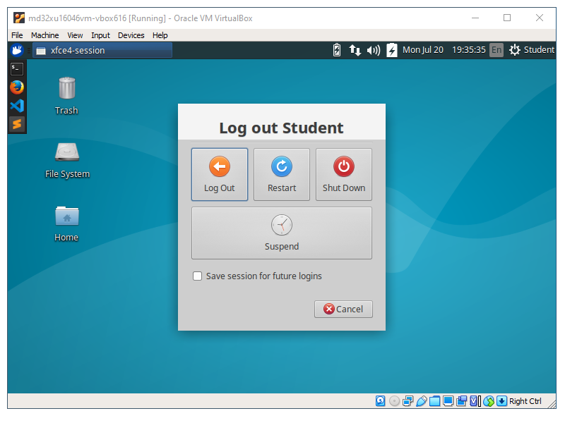 If you get an error when accessing your shared folder, please try this fix and see if it works. Once your Ubuntu 16.04 system is running smoothly, you should never need to shutdown your virtual machine again! Whenever you need to shutdown your virtual machine, you should just suspend it. On Windows, you can simply click on the Close Box and select "save the machine state" to suspend your virtual machine. If you do it this way, next time when you need to start your virtual machine, just click on the green Start button in VirtualBox and your virtual machine state will be restored and this is much faster than cold-booting your virtual machine. Step 4: Backup Files You Have CreatedSince it can take a while for your virtual machine to start, I would recommend that you do not shut down your virtual machine! If you simply close the lid of your laptop, everything will go to sleep, including your virtual machine. Although if you let your laptop battery run out, your virtual machine would crash when your laptop dies. Most of the time, no harm is done when this happens. Although I have heard from students that when you are unlucky, you may not be able to get back into your virtual machine! When this happens, as far as I know, there is no way to recover the data inside your virtual machine! Therefore, it's imperative that you backup files you have created by copying them out of your virtual machine and into the shared folder and use your host machine's backup software to backup your shared folder. It's also a good idea to not overwrite files you have previously backed up (or use a version-control system) in case you need to get back to some older versions of your files.To make backup easy, you should put all your files in one place. For example, you can do all your work somewhere under the Documents folder in your home directory. Then you can do the following to create a backup file and copy it into your shared folder using the following commands: