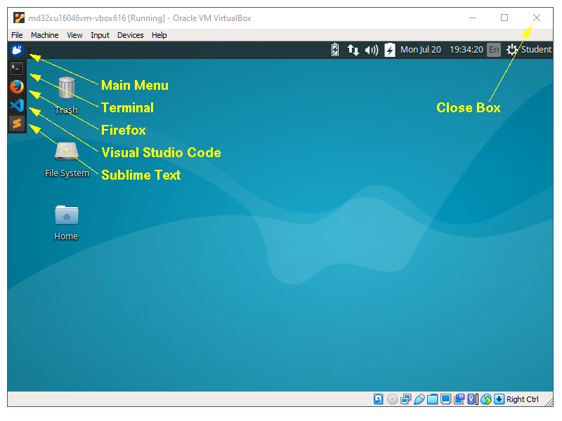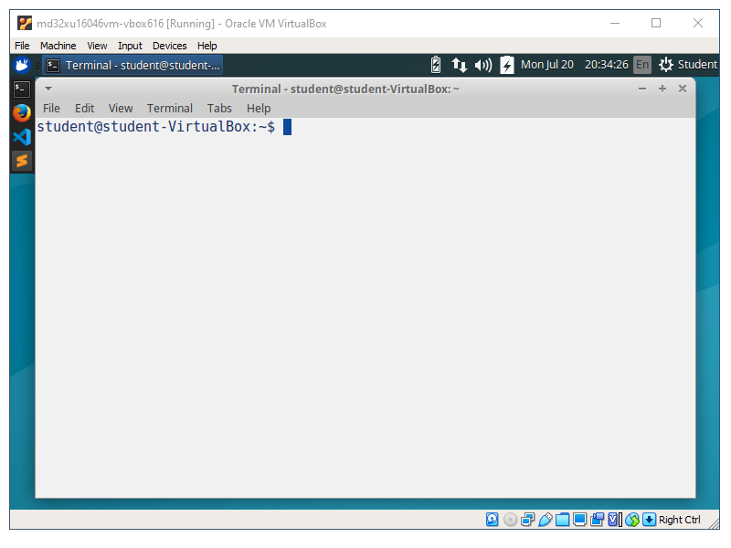 Now you have a "standard" 32-bit Ubuntu 16.04 system running inside UTM! Although I have noticed that this system is quite a bit slower than an AWS instance (for example, compilation takes a lot longer). My guess is that this is because UTM is running in the emulation mode and that can slow things down quite a bit. Maybe if you have a faster hardware, it would run better. Step 2: Start Your Virtual MachineNow your 32-bit Ubuntu 16.04 system is ready to go! The name of your system is "awsvnc32xu16047-vbox6140-f1". All you need to do is to click on the Start button to boot up your 32-bit Ubuntu 16.04 system. So, go ahead an click on the Start button (looks like a green arrow in the above screenshot). It can take several minutes for your system to boot. Be patient.If all goes well, you will see the following screen (this is the XUbuntu Desktop): The above screenshot is from a Windows machine. If you have a Mac, then the screen will of course look different (for example, the menubar will be on the very top of your screen, just like for all Mac applications). On some systems, you will get a popup window saying something about an "Indicator Plugin", just click the Remove button. If you don't see the above screen but get a black screen instead, then you need to trouble-shoot to figure out what's wrong. If you get a black screen, you should first turn off the virtual machine. Since you were not able to start Ubuntu 16.04 successfully, you must do a forced shutdown of your virtual machine. If you are on Windows, you should click on the Close Box as shown in the screenshot above. You will get a popup window asking if you want to "save the machine state", "send the shutdown signal", or "power off the machine". At this time you must select "power off the machine" and click on the OK button. Wait for the virtual machine to completely shutdown (i.e., when the virtual machine window disappears) before proceeding to trouble-shoot. This can take some time, so please be patient. After the virtual machine has completely shutdown, the first thing you should try is to uncheck the Enable 3D Acceleration checkbox and restart and hope that you will get a better result! If you don't, you should contact the instructor. If all goes well and you got the XUbuntu Desktop, please click on the Terminal program and your screen should look like the following: You are logged in automatically by default. Your user ID is "student" and this is an administrator account. Your password is also "student". Please note that this is also your administrator password! Any time you are prompted for the "admin password", you should enter this password. Your default commandline shell is "bash". If you want to switch to use "tcsh", you can just type: