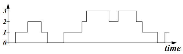 The avarage number of packets in Q1 is the area under the curve divided by the total emulation time. One way to calculation the area under the curve is to slice up the area into vertical bars and use the method mention above to add up the amount of time Q1 has a certain number of packets. This may get a little messy to keep track. Another way to calculate the area under the curve is to look at the above picture and realize that it's the same as adding up the time spent by all the packets in Q1 (you need to look at the above picture carefully to see that this is correct)! Therefore, all you have to do is to add up all the time spent by all the packets in Q1 and you have the area under the curve! (For this assignment, one complication is that you must only consider "completed packets" for this statistics.)![]()